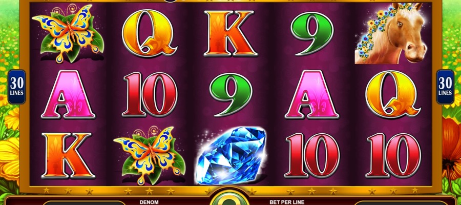 The slot’s background features a field of flowers in front of big mountains. The symbols include a gold butterfly, a hose with flowers, a horse with flowers in its braided mane, a dancing sun, a nymph, a shining diamond, and a golden flower. The game’s features include scatters, wilds, and free spins.