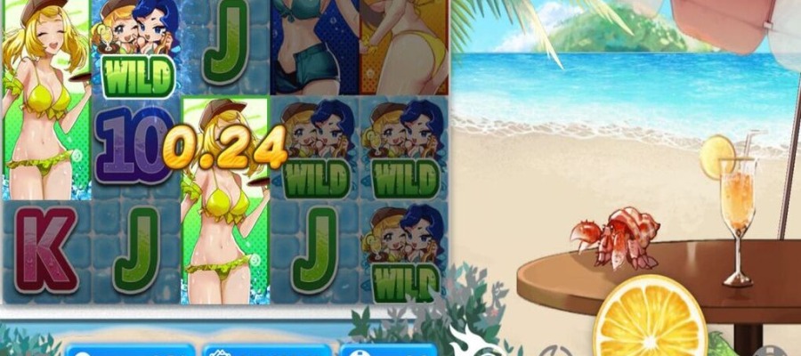 This beach-themed game was provided by Manna Play. It features four expanded base symbols, free spins, and a treasure hunt bonus. The slot’s RTP is set at 97.97%. The backdrop features golden sands, sea, tropical greens, drinks, and a crab. The icons made in an amine style feature four ladies in bikinis and lower-paying card symbols.