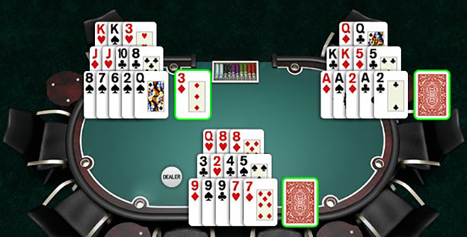 All cards are dealt face-up in Open-Face Chinese Poker, commonly known as OFCP or OFC. Players are dealt five cards to begin with, then eight more cards until they have thirteen. They must make three hands out of these cards: three in the front, five in the center, and one in the rear, each consisting of two five-card hands and one three-card hand.