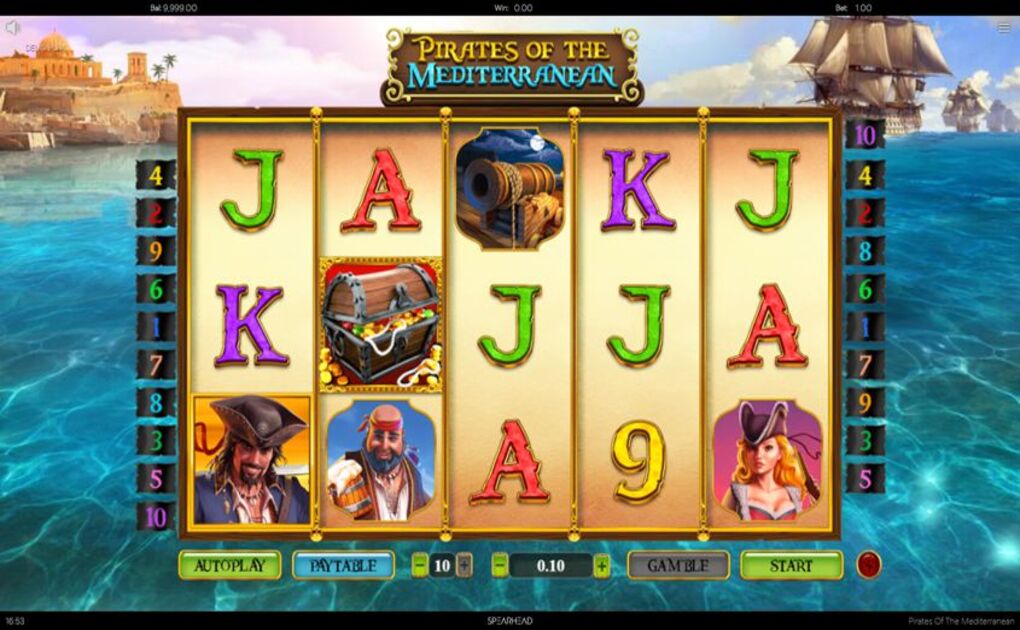 Pirates of the Mediterranean Remastered is a game from Spearhead Studios, played on 5 reels and 10 paylines. The players will notice the Walking Wilds making an appearance across the reels. Wagering requirements vary from 0.1 to £20 per spin. The slot features the parrot acting as wild. Parrots are the symbols with the highest denomination, bringing a reward of 1000x to dedicated punters. 3 matching symbols have to land on the reels to secure the win. The max bet in Pirates of the Mediterranean Remastered is 9000x, with an RTP of the slot established at 96.02%.